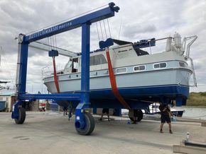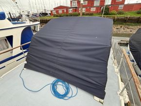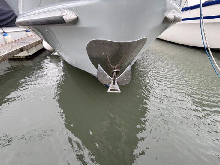 Stainless steel pushpit, pulpit and guardrails with midships gates, davits, bathing platform and stainless steel boarding ladder, Danforth anchor with chain, anchor windlass, windscreen, new flybridge canvas cover 2025, mooring warps and fenders with fender baskets.