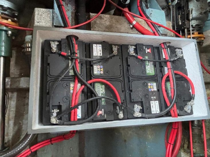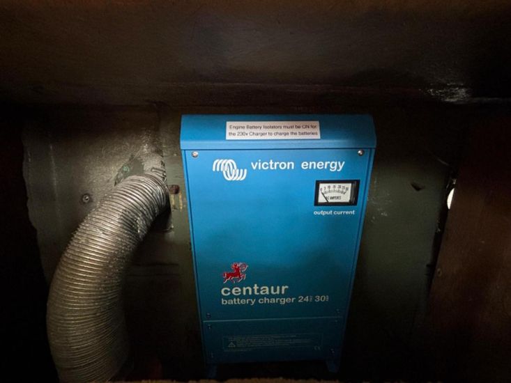Alternator charging to 4 x 12v engine start batteries (new June 2025) and 4 x 12v domestic batteries (new June 2025). 240v shore power with new Victron battery charger in October 2025.