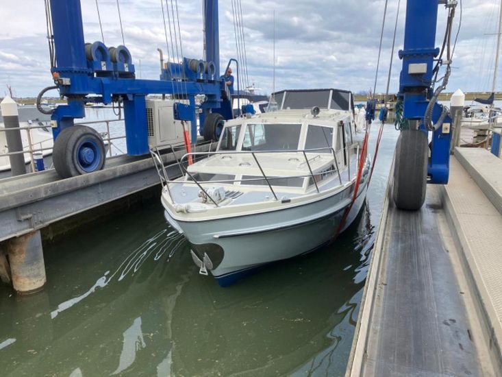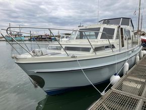 Built in 1977. GRP construction with grey topsides (hull topsides professionally re-sprayed in 2025) and grey superstructure. 5 berths. Bathing platform.