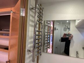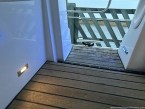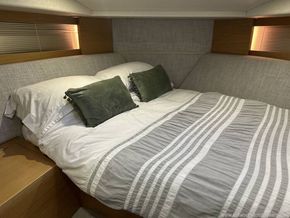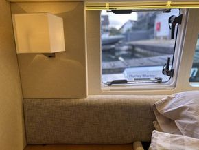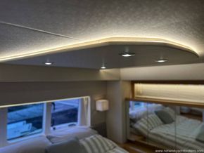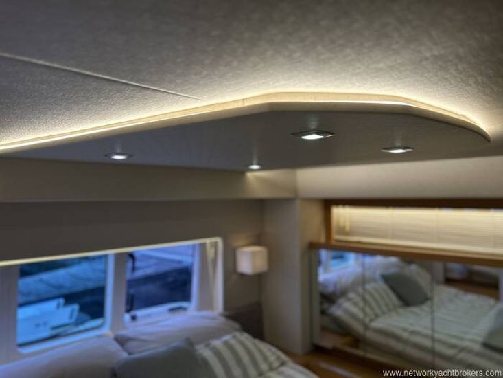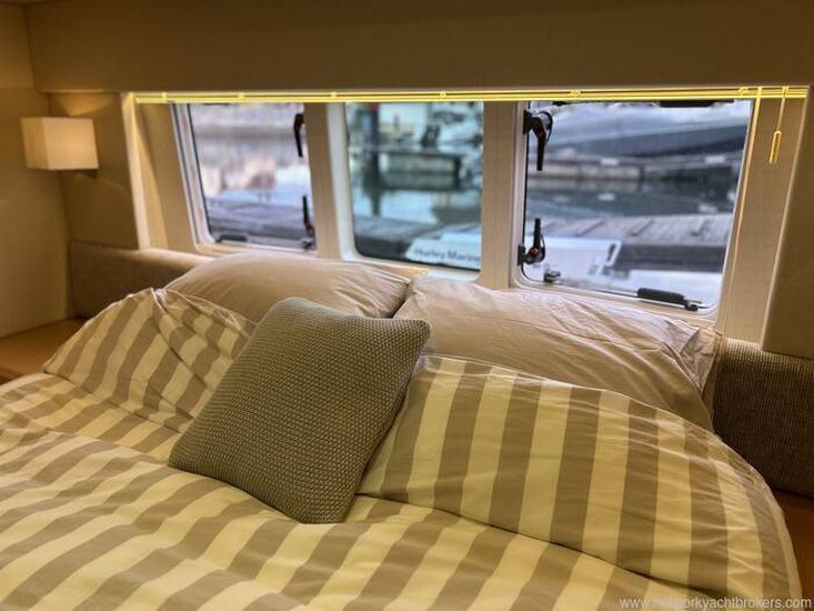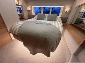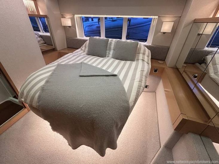 Aft owners cabin hosts a large central island berth with an upholstered bed head, panoramic window giving extensive views from the transom, fully recessed blinds, extensive wardrobe and locker space, mirrors, mixture of large storage cupboards, wardrobe and drawers.