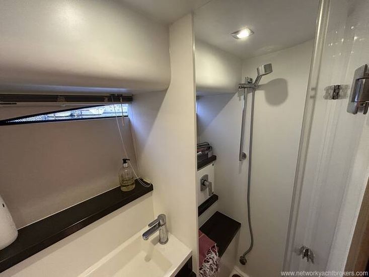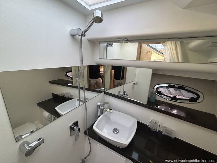 En-suite heads in aft cabin with electric flush toilet, sink and vanity unit and separate shower compartment.