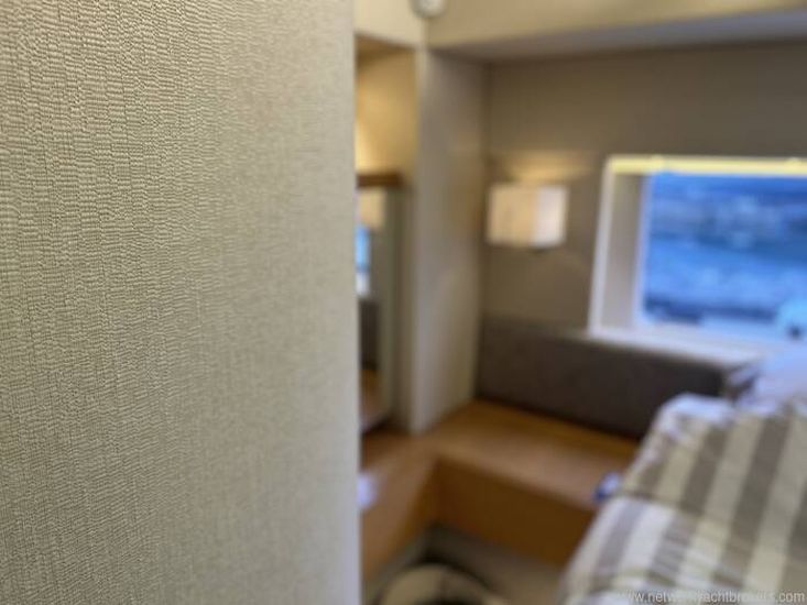 Forward guest cabin is in the upgraded double bed arrangement running parallel to the lines of the boat, upholstered surrounds and hull linings, storage under berths, two wardrobes, mirrors, roof hatch.
