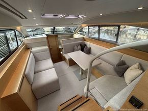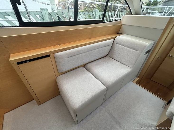 Saloon with u-shaped settee to starboard with under-seat drawers, side cupboard to port with storage under and pop-up TV, chaise lounge with separate stool and storage underneath, electric lift TV, twin roof hatches.