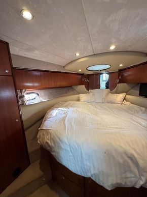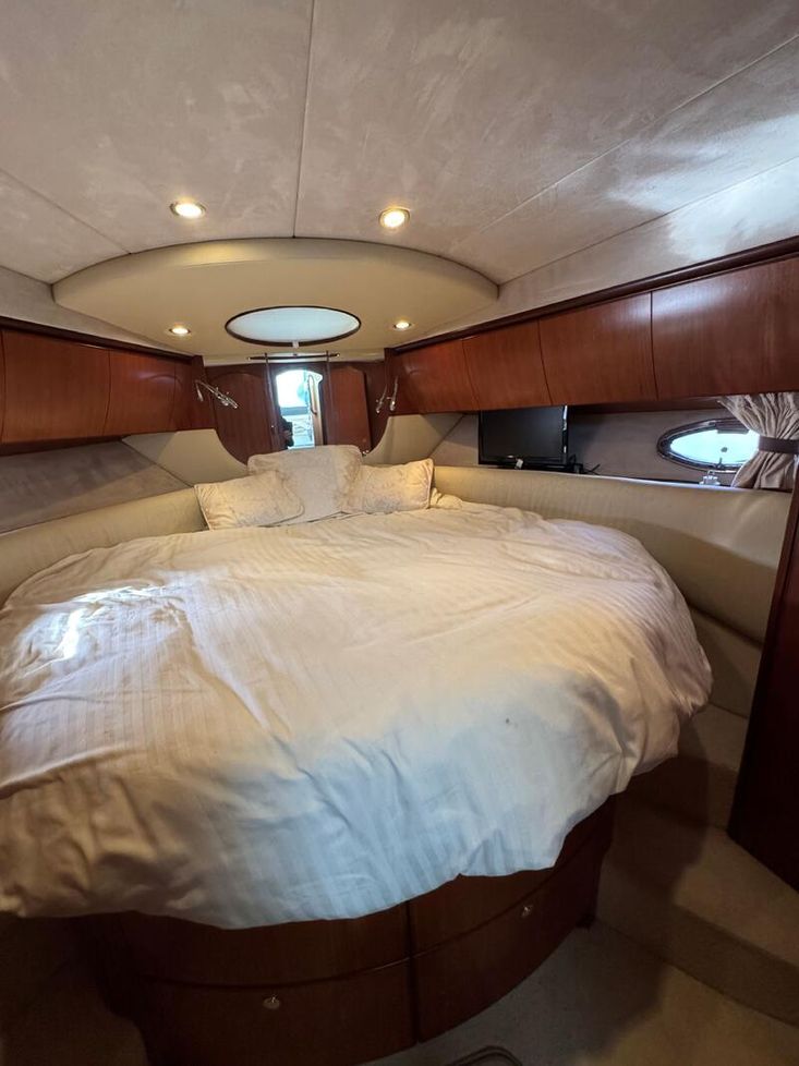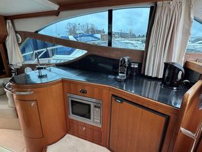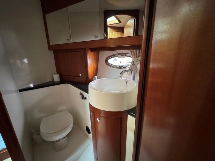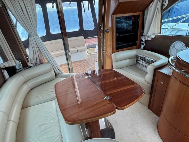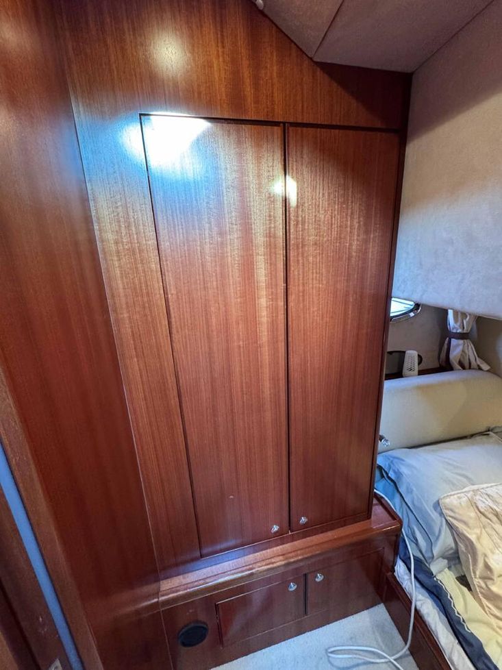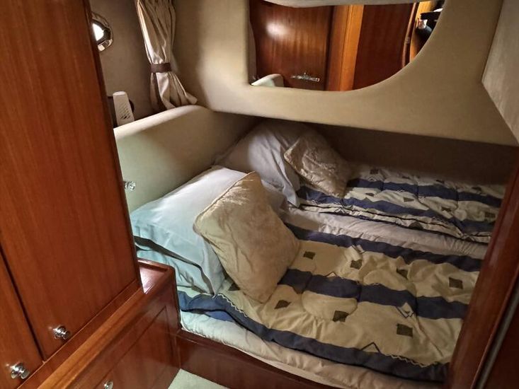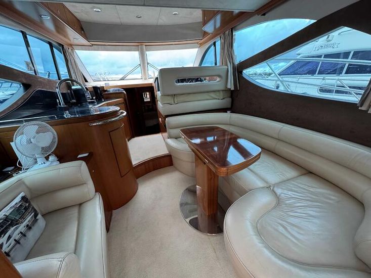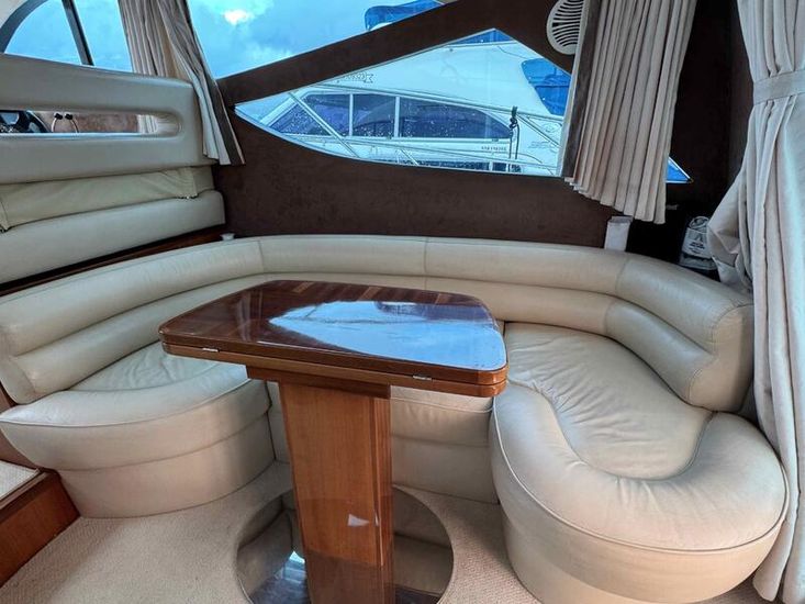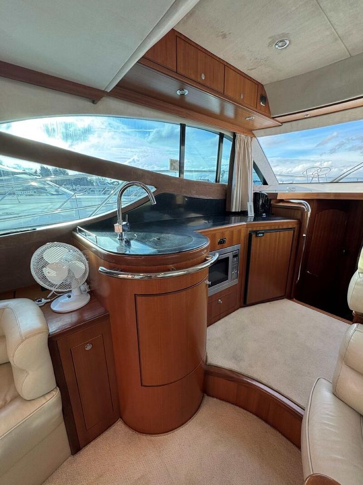 The interior has a luxurious feel with the hi-gloss mahogany woodwork, alcantara panelling, stainless steel work, cream carpets and curtains. This is designed with the "Galley-Up" layout, allowing for the third cabin, giving a single berth or further storage for extra kit.