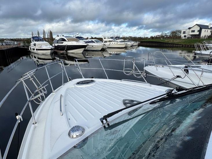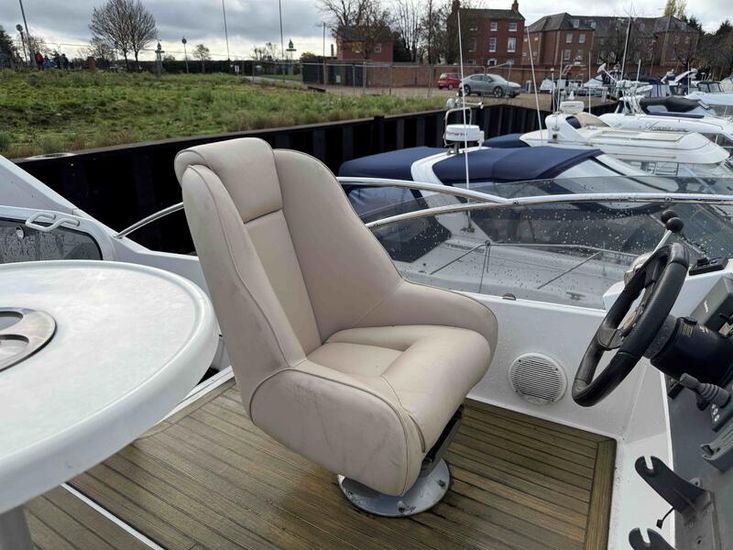 Positioned forward is a helmseat to port and spacious couch to starboard for passengers. Aft is a practical locker for a table, placed under the spacious sundeck.