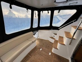 A couple of steps lead up to the galley on the portside and the internal helm station opposite